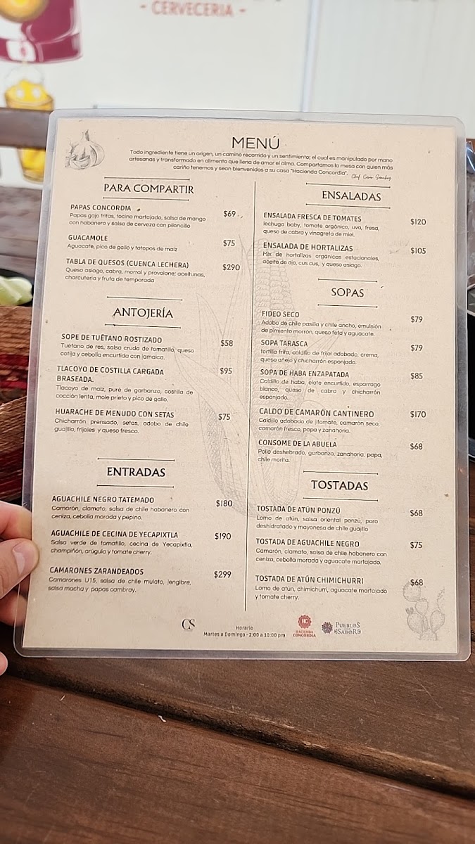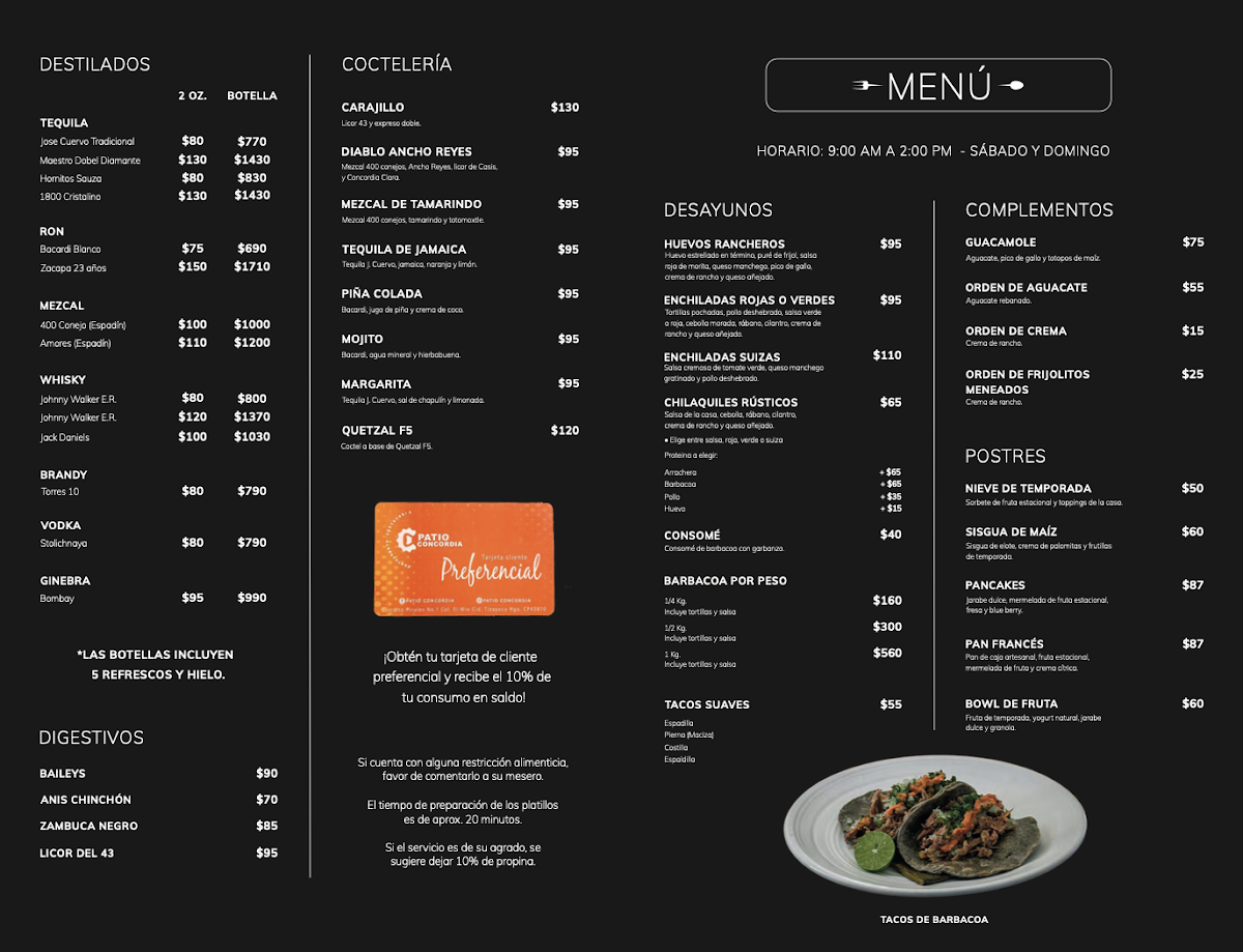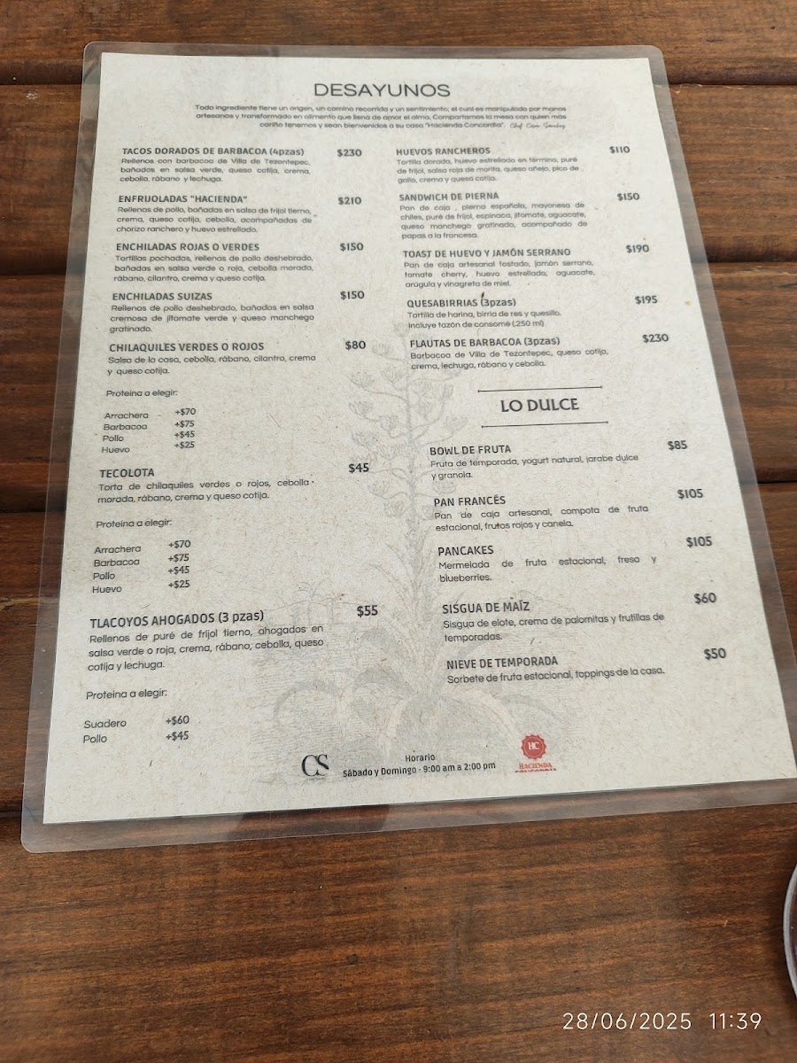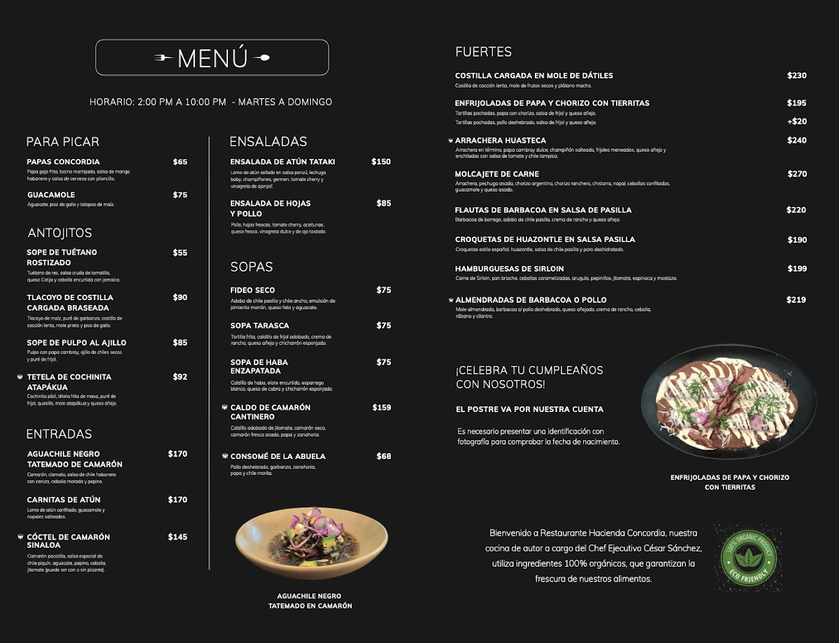 Introducing the menu at Restaurante Hacienda Concordia is a festive journey through authentic Mexican flavors, set amidst the tranquil ambiance of El Mio Cid, Hgo. With a commitment to quality and creativity, this establishment showcases dishes that highlight Mexico’s rich culinary heritage. Guests rave about the delectable tacos de barbacoa, beautifully cooked and generously sized, and the delightful chilaquiles rojos made with freshly fried tortillas. The mole de plátano macho stands out as a customer favorite, while the stunning presentation of each dish speaks to the chef's artistry. Pair your meal with their exclusive Concordia craft beers for a truly immersive experience. Reviewers appreciate the attentive service, spacious setting, and reasonable prices, making Hacienda Concordia a must-visit for anyone wishing to savor exquisite Mexican cuisine. Whether for a casual dinner or a special occasion, this restaurant promises a memorable culinary adventure.